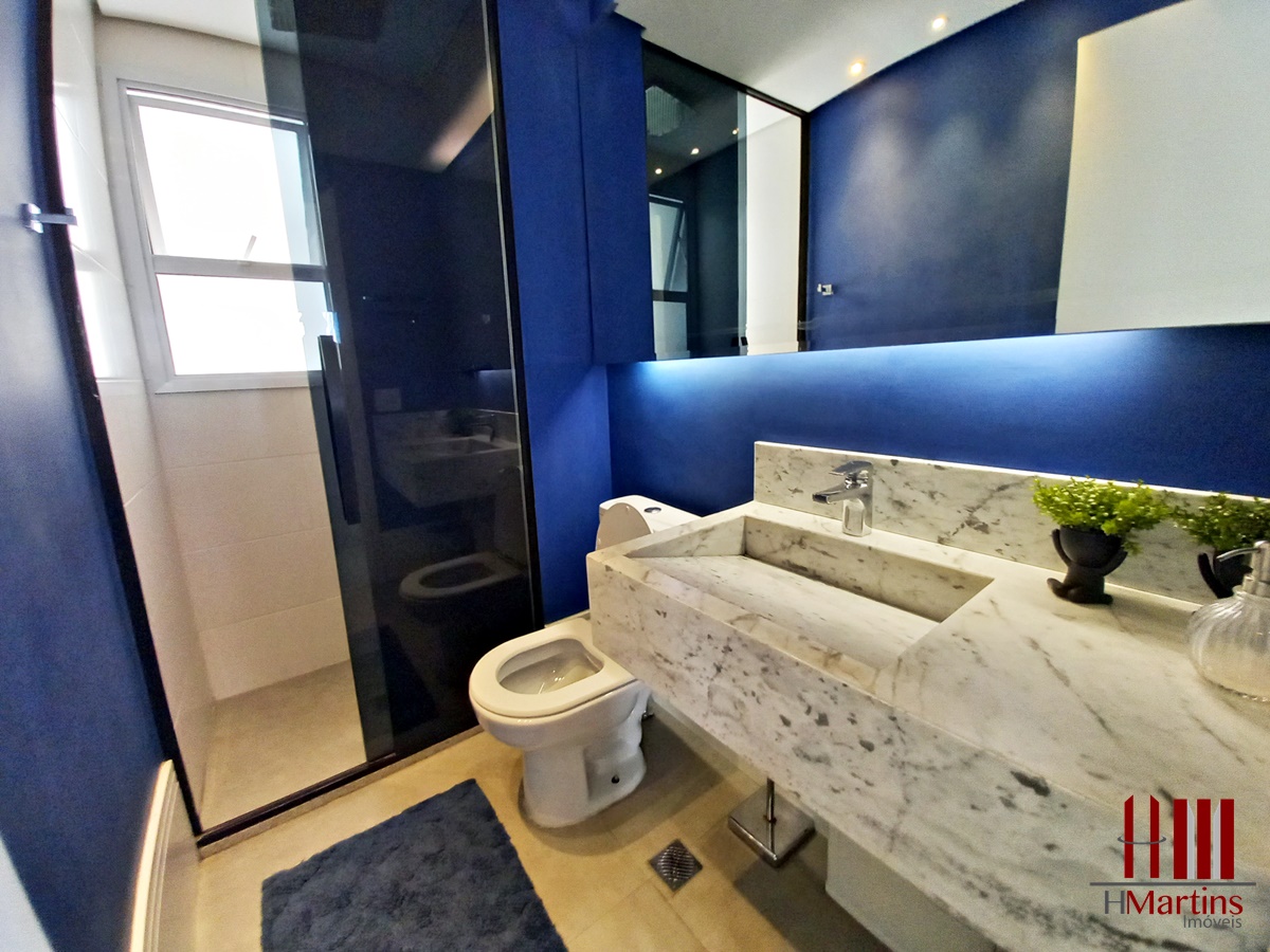 Banheiro com revestimentos em porcelanato, sanitarios em louça, armários, e box em alumínio.